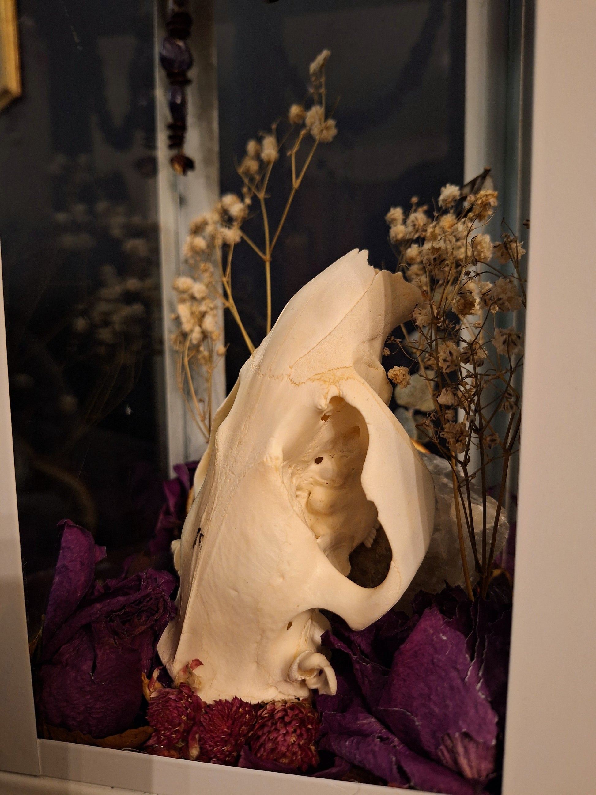 OOAK handmade oddities lantern featuring a beaver skull, dried florals, and clear quartz