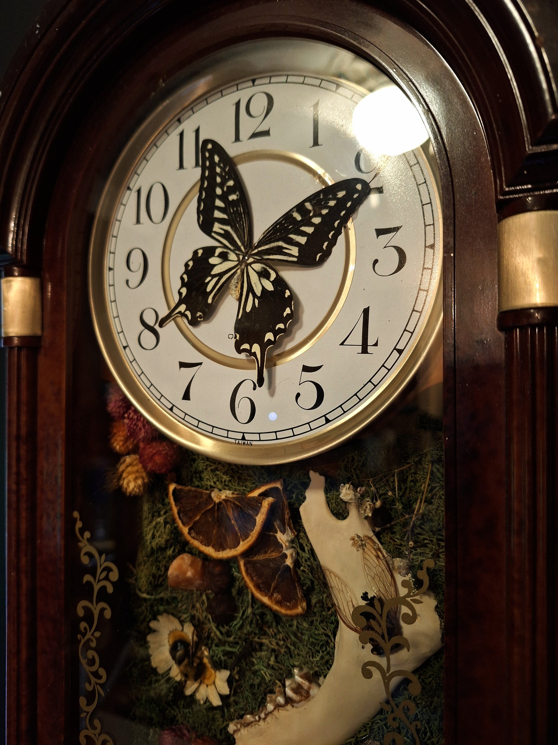 OOAK oddities clock made with a swallowtail butterfly, jaw bone, bee, partial cicada, butterfly cocoon, and dried florals